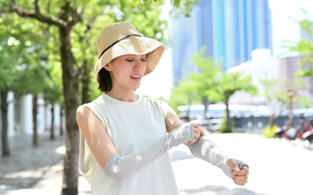 日焼け止めを塗るだけでなく、帽子やサングラス、日傘、アームカバー、UVカットストールなどの紫外線対策アイテムを使うことも効果的です。UV対策をしっかり行うことで、シミやシワの予防になり、肌の老化を防ぐことができます。